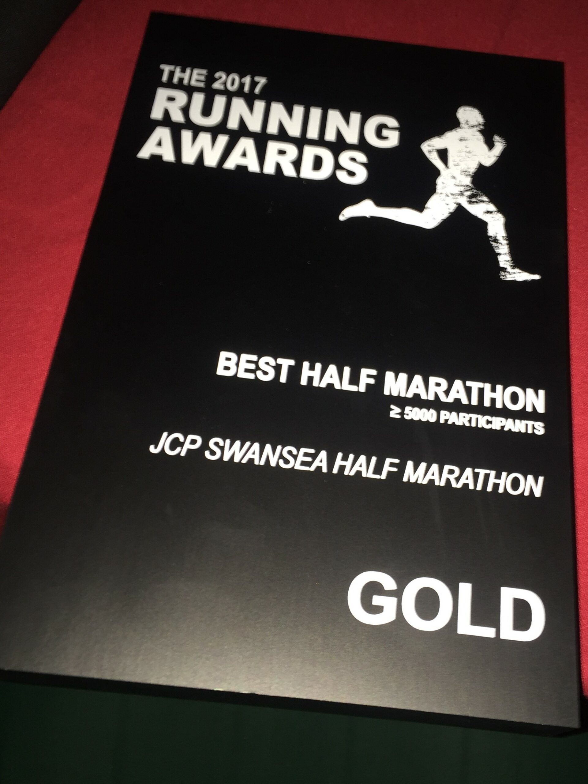 The JCP Swansea Half Marathon was awarded gold after receiving the most votes by runners at the only independent awards ceremony that celebrates the best of running and its culture. The event took place at Indigo in the O2 on Thursday (20th April) where Tash Smith, Race Co-ordinator was presented with the trophy from the BBC’s Mike Bushell, in front of a room full of A-list names from the running and sports industry, making the award the most sought after and coveted amongst races across the UK.